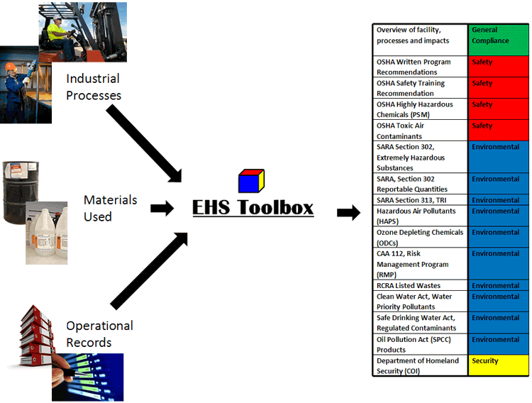 EHS Toolbox takes information about your Industrial Processes, Materials and Operations and yields a compliance diagnosis with virtually every domestic Safety and Environmental compliance requirement.