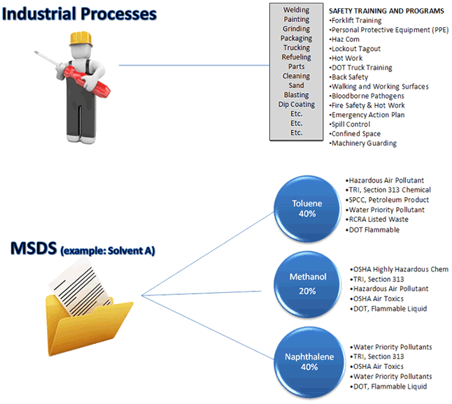 By evaluating each Process and Material (MSDS) individually, EHS Toolbox provides an accurate evaluation of each facilities environmental and safety compliance needs.